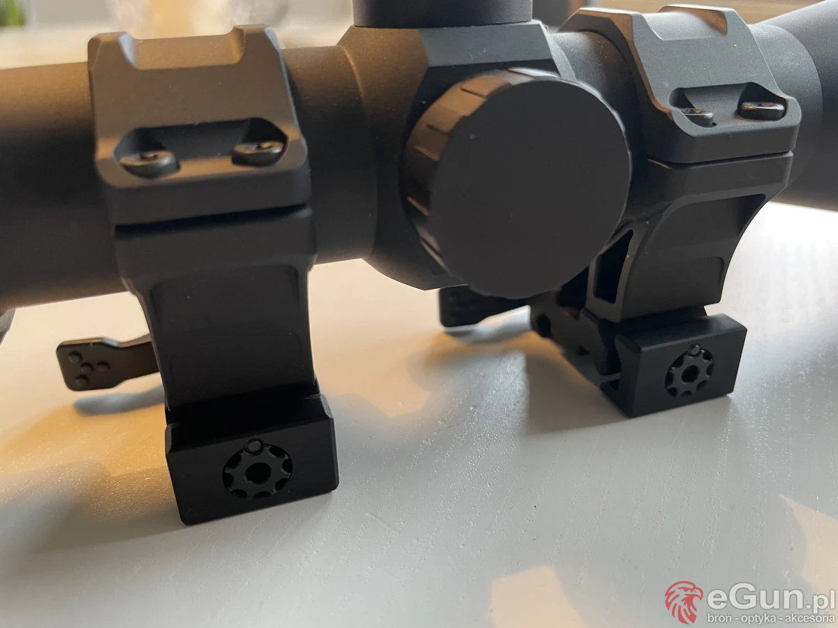 Niskoprofilowe wieżyczki mają regulację 1/4 MOA. Zakres regulacji krzyża wynosi 60 MOA w pionie i poziomie. Pokrętła bębnów mają moletowane ścianki, które pozwalają na obsługę lunety w rękawicach taktycznych.