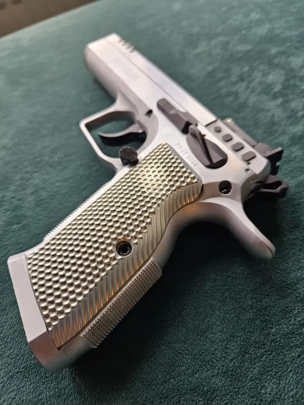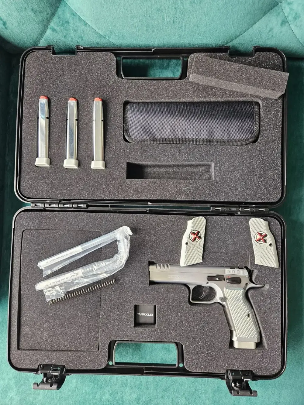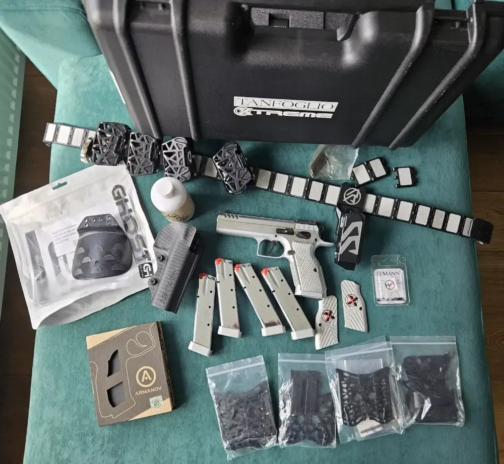 Zestaw kompletowany od marca 2025, wszystko kupowane fabrycznie nowe. Kontuzja wyeliminowała mnie z zawodów pod koniec lipca 2025, więc całość używana była tylko przez 4 miesiące. Tanfoglio jest prawie jak nowe, można powiedzieć, że po dotarciu, reszta zestawu tak samo. Założone okładziny Armanov znacznie poprawiające chwyt. Oryginalne okładziny w zestawie. Sprzedaję wszystko co widać na zdjęciach. Koszt całości, wraz z tuningiem wyniósł około 15 000 zł. Cały zestaw w cenie samego pistoletu.