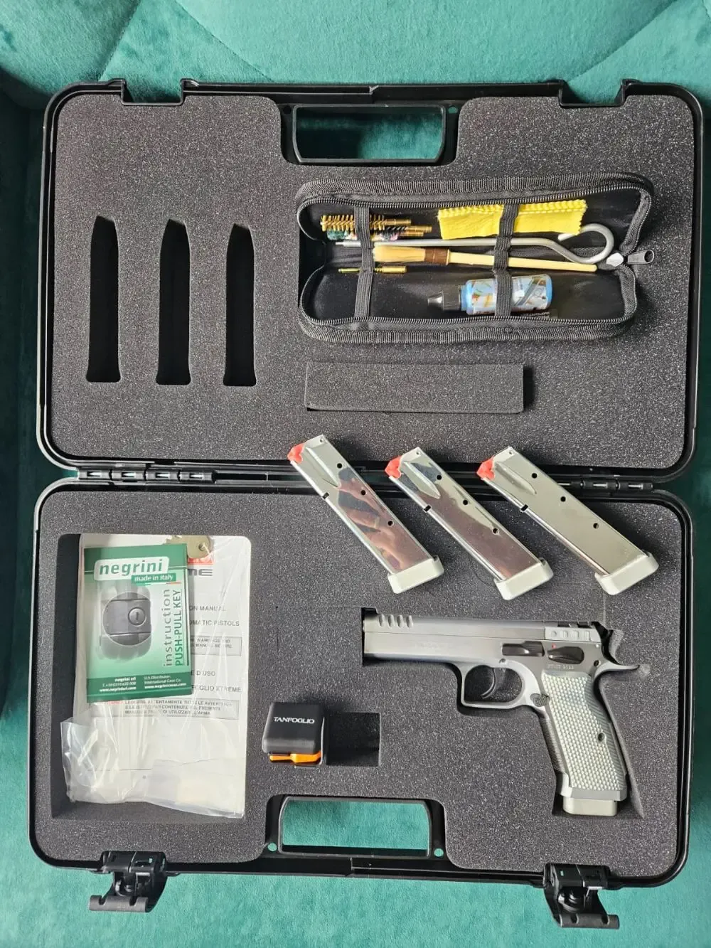 Tanfoglio Stock II Xtreme w wersji Chrome, okładziny ARMANOV, wieszak DAA Alpha-X, pas DAA Lynx i ładownice DAA X-Ray Aluminium z walizką i kompletem fabrycznych części.