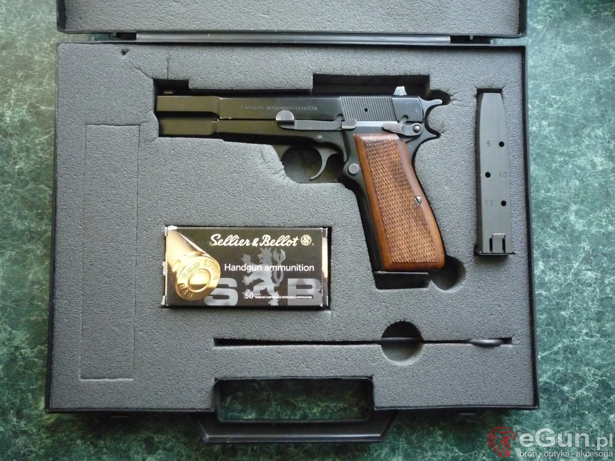 Klasyk z lat 90.Produkcja belgijska stan bdb.W zestawie: 2 magazynki,2 pary okładek rękojeści,kabura Fobus na broń i magazynek ,oryginalna fabryczna walizka,trochę pestek.